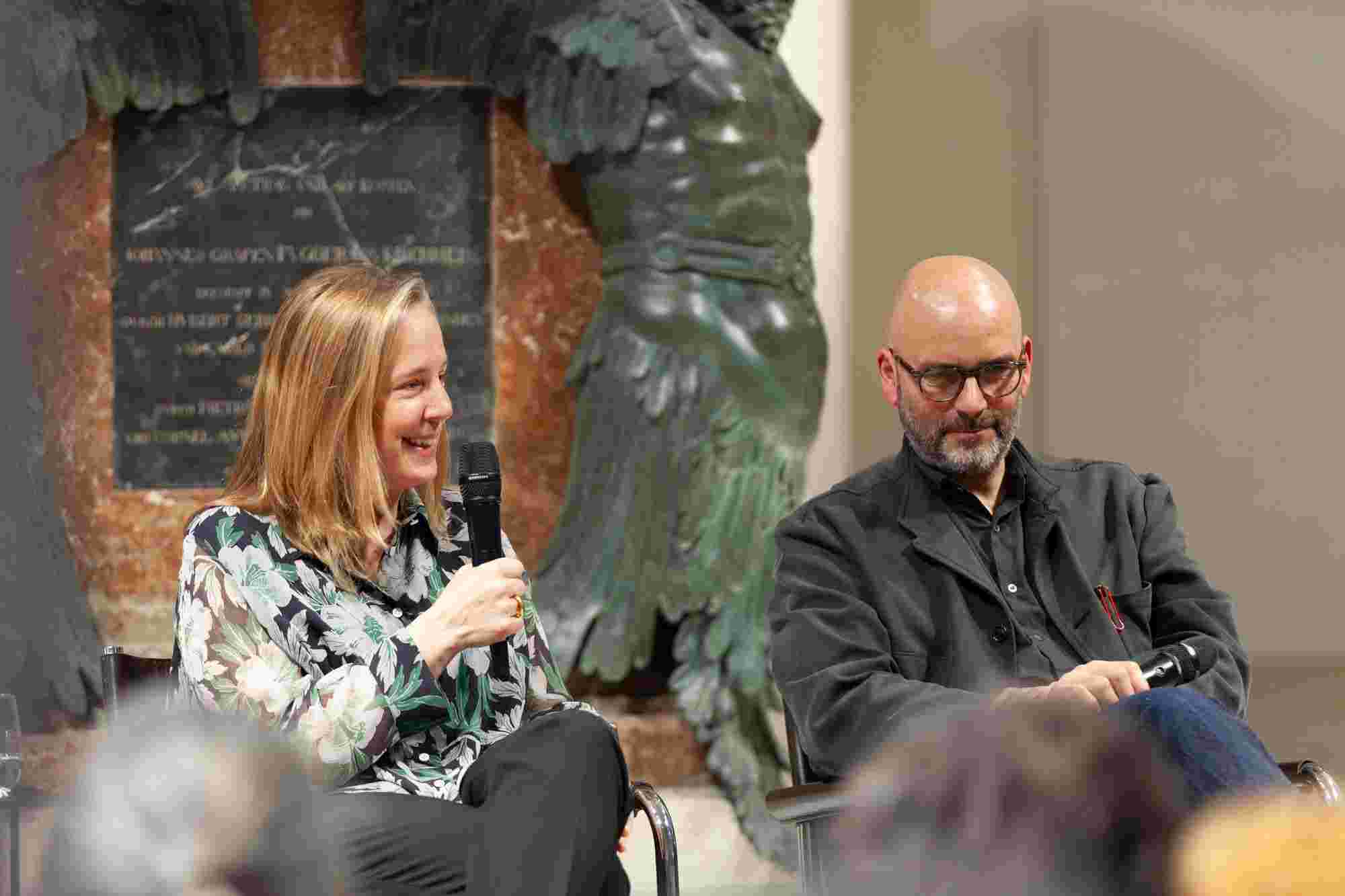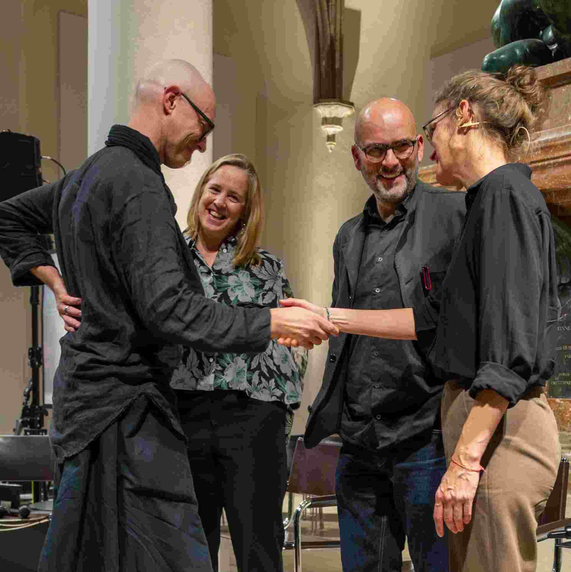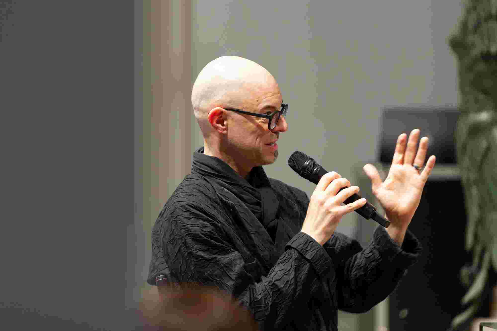 Unter dem Titel „Resonanzen“ sprachen der Künstler Ernst Gamperl, der Züricher Jazzpianist Nik Bärtsch und Sheila Loewe, Vorsitzende der Loewe Foundation, mit Julie Metzdorf (Moderation), über die Beziehung von Material und Mensch, über Hingabe und Aufmerksamkeit im Schaffensprozess und die Bedeutung von Wegbegleiter:innen. Musikalisch begleitet wurde der Abend von Nik Bärtsch.